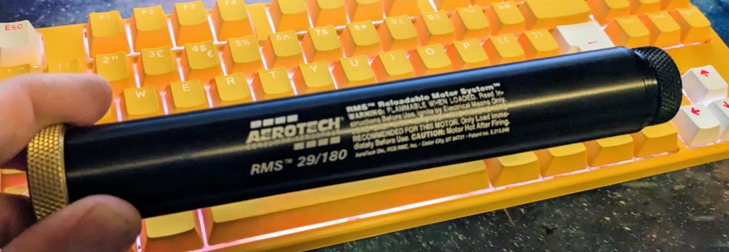 The H128W motor has an assembled mass of 215 g (according to the Aerotech website). Wizard Rockets were happy to post the RMS 29/180 casing (which is inert aluminium), but for safety reasons would not post the reloadable propellant. The composite propellant is hazardous, thus many couriers will not permit transport. Additionally, Wizard will only hand over such a high-power motor to someone with the appropriate UKRA certification.