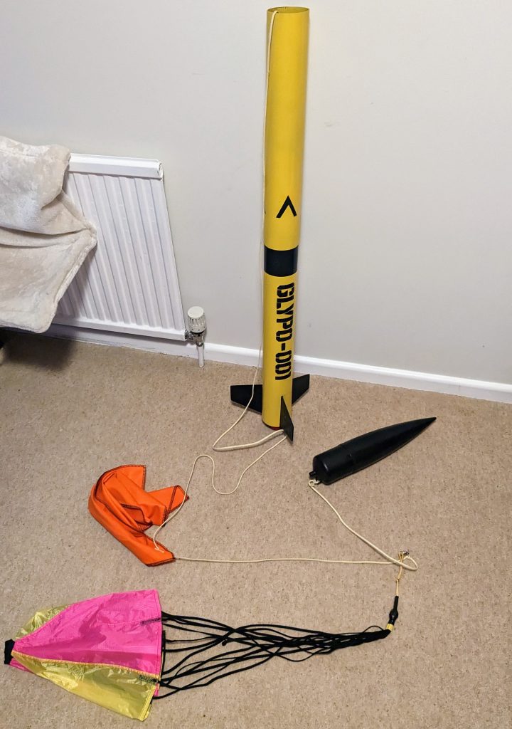 The tallest model I have built prior to undertaking GLYPO-001 is an Estes Mercury Redstone (above right), which stands at 2’5”. This rocket, however, uses C-class motors. The most powerful model that I have built is an Estes Big Daddy (above left), which at 1’8” is shorter but more stubby, and launches spectacularly slowly with D-class motors. With these low-powered models one simply glues a little elastic cord to the side of the cardboard body tube.