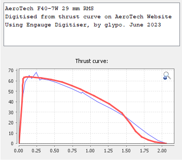 As was the case previously, the thrust curve in OpenRocket (right) does not correspond to that from AeroTech (left). Therefore, I have taken the manufacturer’s curve and digitised it using Engauge Digitiser. It now better represents the AeroTech data, with near-identical impulse. I have included the RASP file should others wish to use it.